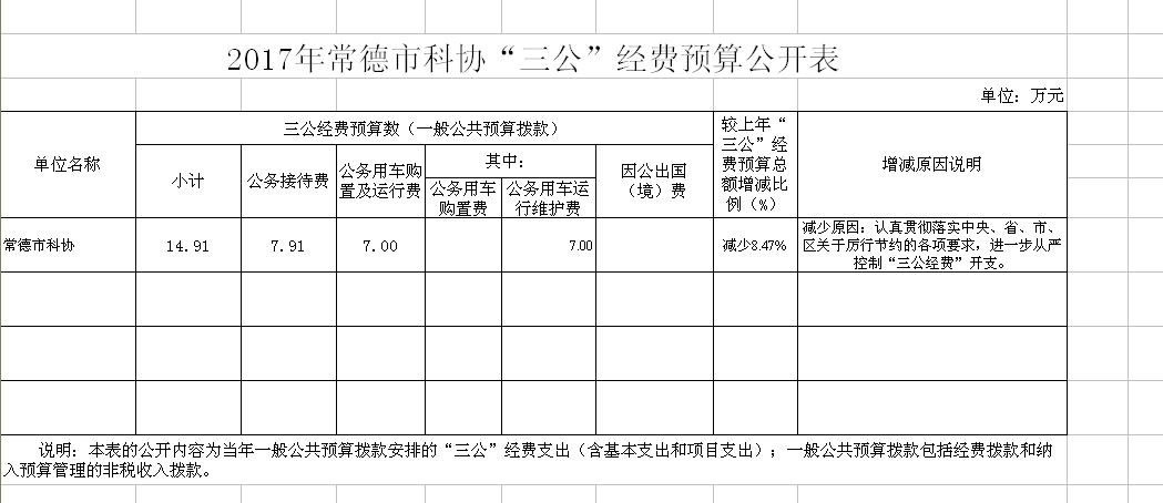 常德市科协2017年“三公”经费预算公开表