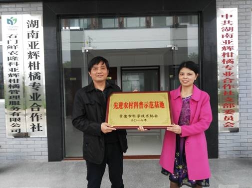 县科协主席曾宪妮(右)中欧柑橘健康植保示范基地授牌