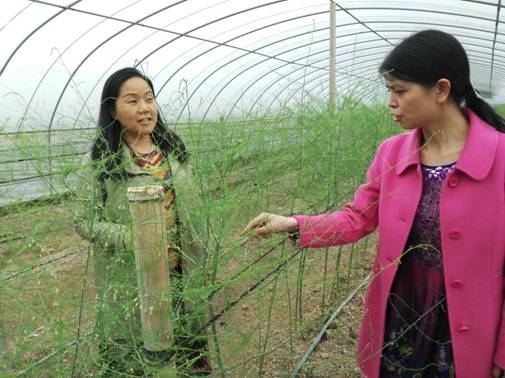 稼和农业蔬菜科技示范基地负责人陈海平陪同县科协主席曾宪妮考察芦笋生产情况