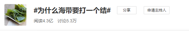 前不久,微博热搜上的一个名为#为什么海带要打一个结?#话题引发了4亿多人次围观。