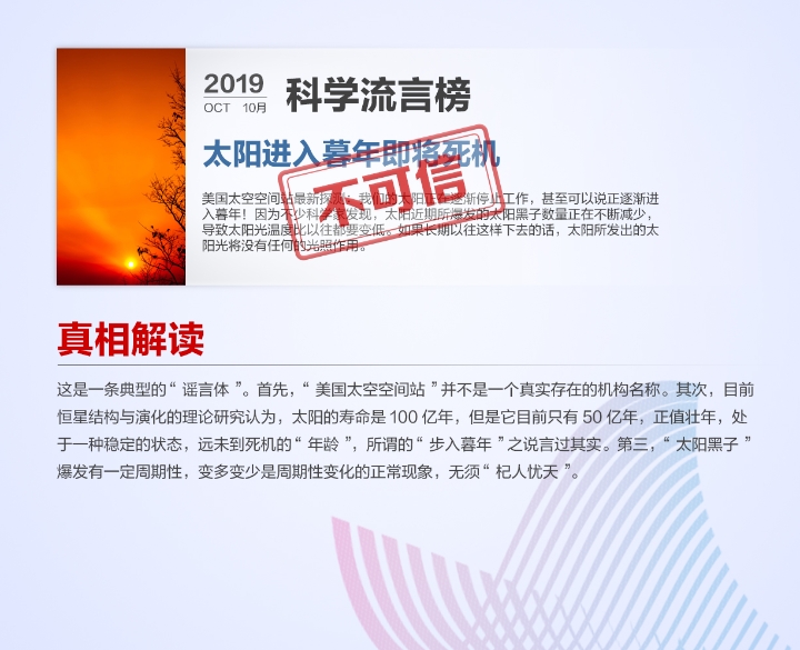 中国科协发布10月"科学"流言榜 发布时间:2019-11-12 信息来源:科普中国网 点击次数: 次 【字体:小 大】 “负压回火效应”会使燃气瓶爆炸?量子波动速读可以提高学习能力?太阳进入暮年即将死机?中国科协发布10月“科学”流言榜单,为你一一揭开真相。 信息来源于:科普中国网 【打印正文】 分享到:
