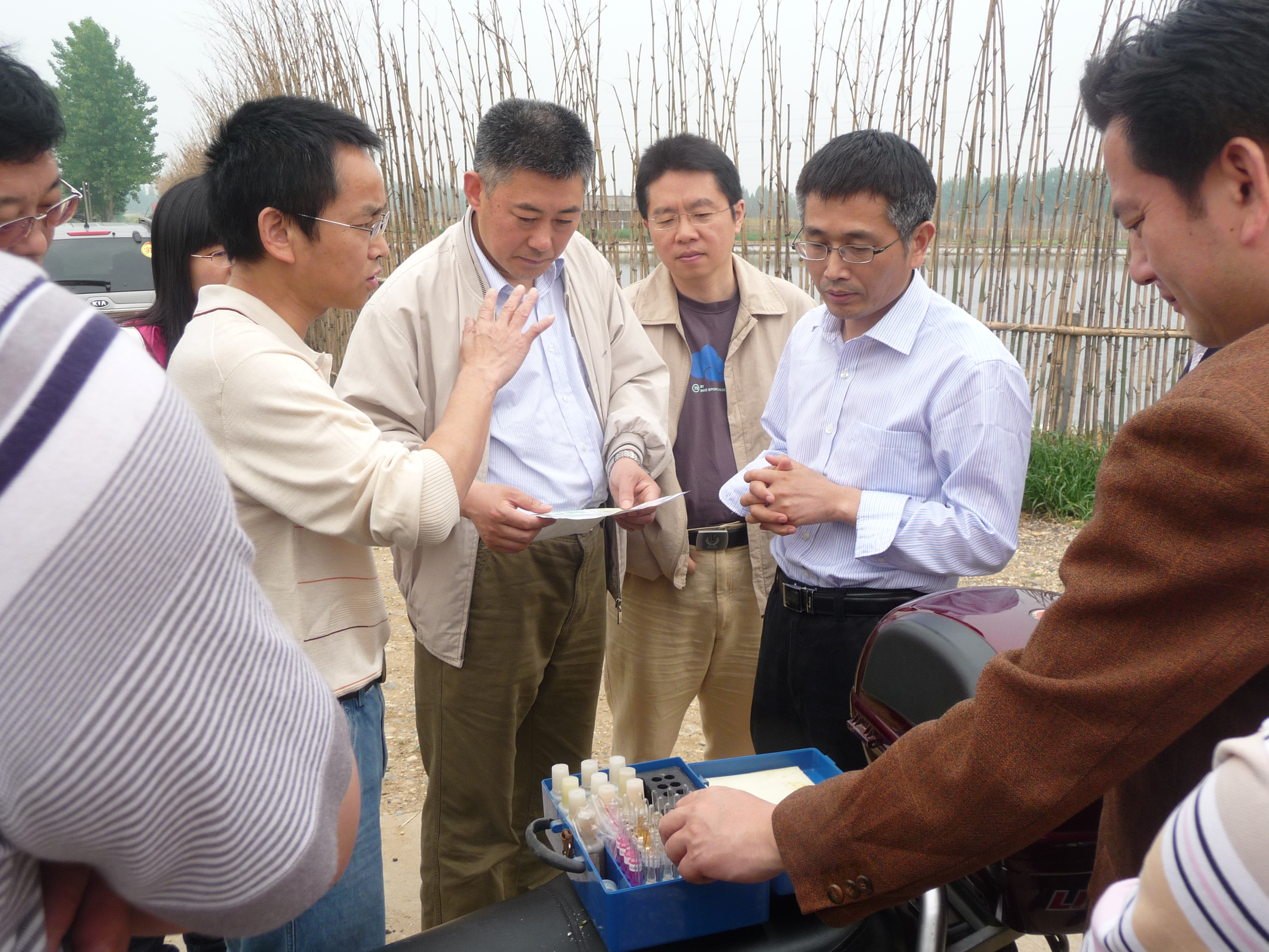 刘寅初(图左一)在向农业部专家介绍水质监测情况