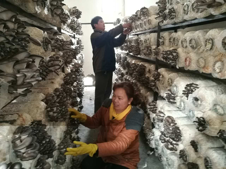 常德市金寺山食用菌基地,菌农赵文杰、夏中萍夫妇正在采摘蘑菇。2016年初,夫妻俩回 乡创业,采用秸秆仿野生栽培食用菌技术种植蘑菇,创造年收入达20万元。秸秆仿野生栽培食用菌技术和 传统栽培技术相比,利润上升15%,且绿色环保,不使用农药和化学肥料,利用原本需要焚烧的稻草、麦 秸、玉米杆等秸秆作为原料,培育出细嫩肥美环保健康的蘑菇。