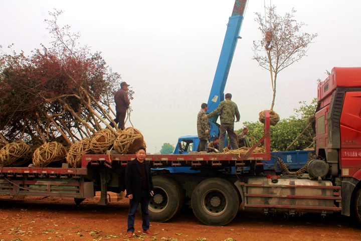讲课结束后,学员们来到复兴镇花卉苗木销售市场,现场感受了红继木的销售情况。在这里,5辆来自江浙的大货车正在装载红继木等苗木。笔者了解到:一颗茶杯口粗细的红继木,卖价在1000元以上。
