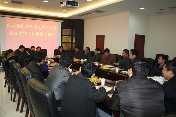 会议由市政府机关党委书记陈显球主持。市科协副主席、纪检组长、机关党支部副书记文善武在会上汇报了2010年以来市科协创先争优活动开展情况及取得的工作成绩;与会人员学习观摩了市科协创先争优活动及党务工作资料;会议对2011年市政府机关党委工作进行了部署。