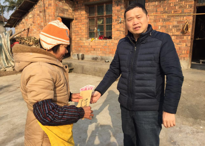 鼎城区科协主席杨建新为因病魔失去双亲的黄逸民送春节慰问金,并鼓励他重振精神,好好生活。