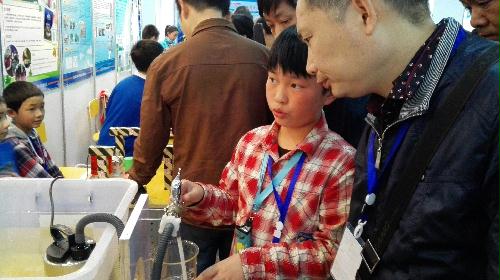 我市最小参赛代表王少文同学向观众介绍、演示作品