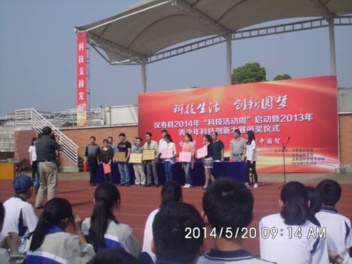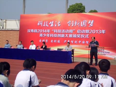 5月20日,汉寿县“爱科学bull;爱创造bull;少年智则中国智”2014年“科技活动周”启动暨2013年青少年科技创大赛颁奖仪式在汉寿县龙池实验中学举行。