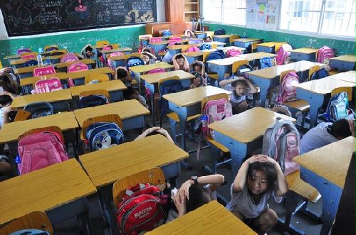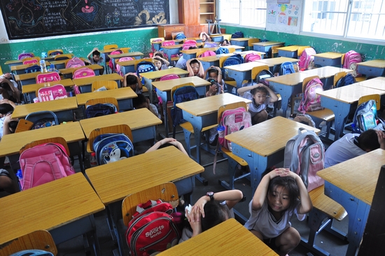 地震警报铃声响起,大家迅速躲避