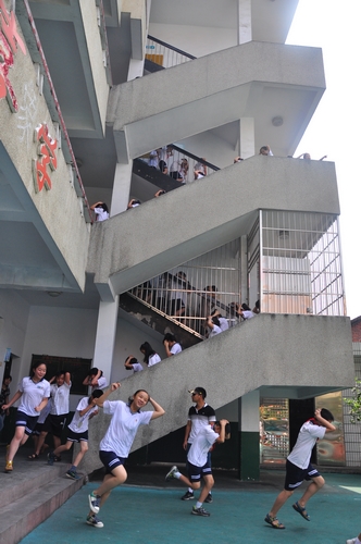 校方事先通过校园广播强调了防震演习的一些注意事项。9时40分,伴随着地震警报的响起,演习正式开始。老师带着学生有序撤离教学楼,并用手护住脖子,向操场跑去。整个过程紧张有序,学生们把刚才听到的地震安全知识,运用到了具体的实践操作当中。