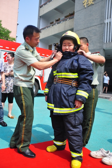 武陵区公安消防大队杨队长为学生穿上消防“战袍”,让同学们过把当小消防员的瘾