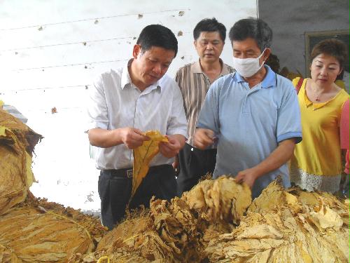 市科协主席李守海(左一)在观察烤烟成色