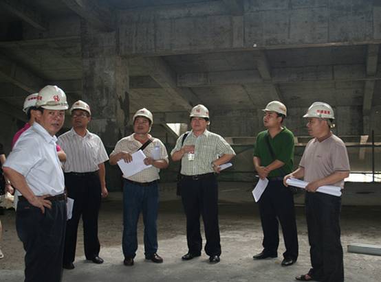 省科协副巡视员罗术根(左二)一行在市科协主席李守海(右一)的陪同下视察常德科技展示中心施工现场(一)