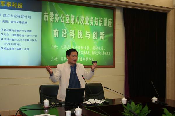 本次讲座由市科协秘书长、副研究员、市委党校客座教授文善武主讲《前沿科技与创新》。主要内容包括:空间及军事科技、信息科技、医学科技、交通科技和新能源、新材料及综合科技等五个部分。文善武同志通过列举大量的实例,讲述了当前世界前沿科技的发展现状与趋势,受到了参训人员的热烈欢迎。