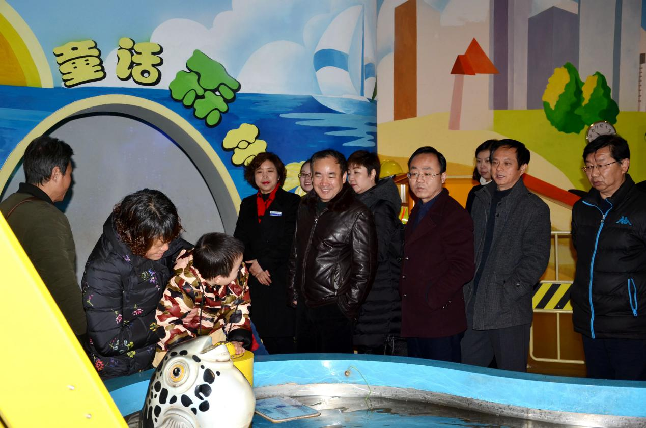 (黄石市科协副主席陈汉松(右二)陪同我市科协党组书记、主席谭卿平(左五)一行参观儿童科学乐园展厅)