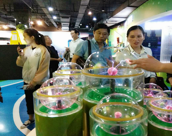 长沙 县科协主席李红军(右一)在常德科技馆馆长助理陈湘平(右二)的陪同下参观智慧之光展区