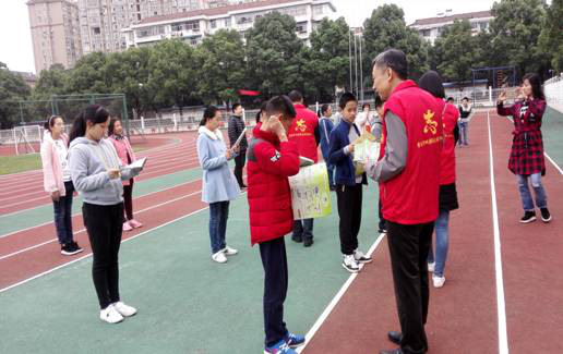 志愿者为市三中学生边发放资料边讲解