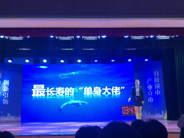 在自主命题讲解环节,我馆讲解员皇海涵以《最长寿的“单身大佬”》为题,用深入简出的语言科普了格陵兰鲨长寿的原因,让观众了解了这个以缓慢动作著称最长可活到500多岁的“单身大佬”格陵兰鲨。落落大方的肢体语言、生动形象的讲解方式赢得现场观众和大赛评委的一致好评。