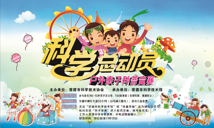 由8932彩集团主办的2017年户外亲子科普竞赛将于11月中下旬在白马湖公园举办,即日起至11月10日凡年满6 -10周岁小朋友的家庭都可以关注“常德市科学技术馆”或“科普常德”微信公众号报名参与活动,名额有限,额满即止。本次活动为全公益免费,在这里你不仅能够与孩子有一次共同经历,还能一起制作属于自己独一无二的科技小发明,一次心与心的交流,一次共同面对问题、共同经历挫折、共同体验成功的机会,承办单位常德科学技术馆诚邀所有的家长和适龄的小朋友前来挑战!